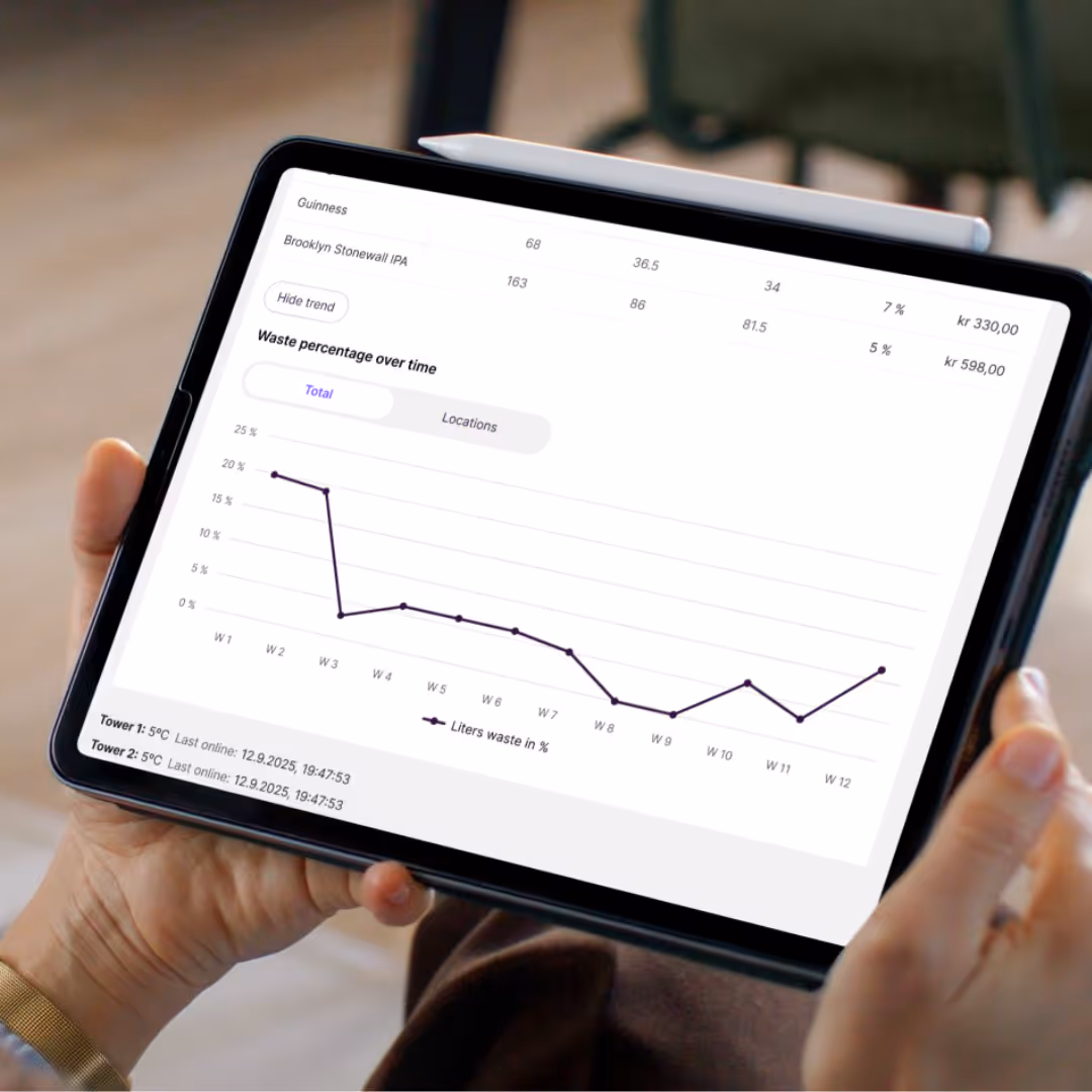Alt som tappes kobles direkte mot salget. Blir en øl tappet uten at den registreres som solgt, varsles det umiddelbart som et avvik. Du ser svinnet idet det skjer, ikke i etterkant.